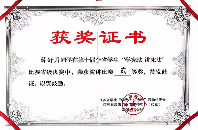 此次赛事竞争激烈,历经校赛选拔推荐、省级初赛的层层筛选,薛舒月同学从百余位高校组参赛者中脱颖而出,成功跻身省级决赛。决赛设置主题演讲与即兴演讲两大核心环节,全面考察选手的宪法认知深度、语言表达能力与临场应变水平。在主题演讲环节,薛舒月以《宪法之光 守护成长》为题,将真挚情感与深刻思考融入演讲之中,以情带声、以思促讲,用生动的表达传递宪法精神。在极具挑战性的即兴演讲环节,她沉着冷静、思路清晰,围绕“法治宣传在家庭、学校与社会生活中的法律实践”展开精准论述,逻辑严密、语言流畅,展现出对宪法精神的深刻理解与扎实的法治素养,最终凭借稳定发挥斩获佳绩。
