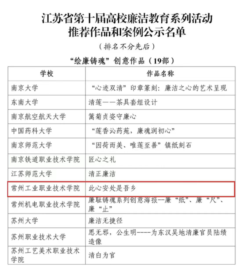 第十届高校廉洁教育系列活动由教育部思想政治工作司主办,以“清风育德守初心廉洁笃行担使命”为主题,旨在深化新时代高校廉洁文化建设。江苏省教育厅经高校推荐、专家遴选,共选出114件优秀作品和案例,其中“绘廉铸魂”创意作品19部。由我校党委宣传部选送的刻纸作品《此心安处是吾乡》光荣入选。
