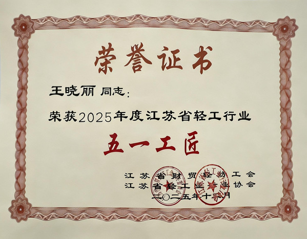 中国工艺美术大师王晓丽深耕工艺美术领域三十余载,坚守匠心、精益求精,在技艺传承、创新创作、教学育人与社会服务等方面成绩斐然。本次获评“2025 年江苏省轻工行业五一工匠”,是对其专业造诣、工匠精神与行业贡献的充分肯定。
