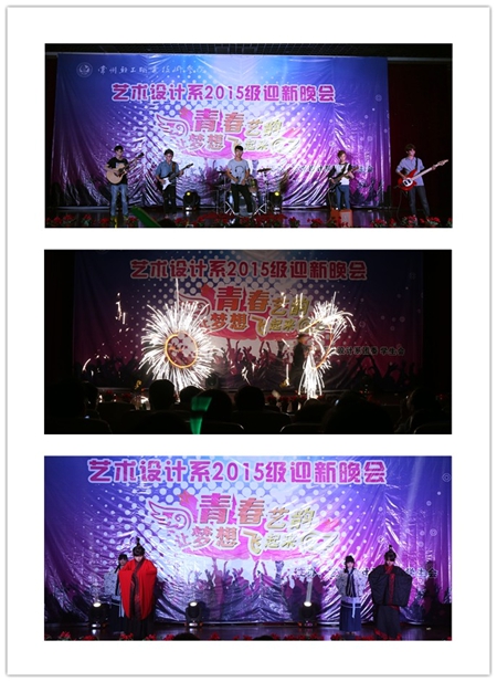 在新起点乐队带来的精彩表演后,赵书记登台致开幕词,拉开了“青春艺韵”迎新晚会的序幕。整台晚会节目内容新颖、丰富多彩,主要由我系各个社团选送。Only Dance舞蹈协会的爵士舞《energetic》、动漫社团的cosplay秀、精武社的双截棍表演《无双》、雨沫话剧社的搞笑话剧《艺考》……一个个精彩绝伦的节目为现场观众呈现了丰盛的视听盛宴。一段感人的军训视频后,由15级新生带来的大合唱《强军战歌》聚焦了所有人的目光。新生们统一穿着军训服装,用自己的歌声和大家一起共同回忆那段痛并快乐着的军训时光。随后汉服社的汉服展示《礼仪之邦》以及理颜形象社的走秀节目《shining love》继续引爆全场,台上模特靓丽多姿,她们那轻灵而娴熟的体态、动感而激情的走姿以及她们与音乐完美的融合,无不感染着在场的所有观众,赢得了台下的阵阵尖叫与掌声。当现场大屏幕放下,同学们看到自己通过电脑和手机发表的祝福留言被实时显示在“人人墙”上,并开始根据ID抽奖时,晚会现场的气氛达到了最高潮,雷鸣般的掌声、尖叫声经久不息,同学们用这样一种方式共同表达着对15级新生的欢迎和对艺术创意学院的热爱之情。