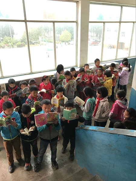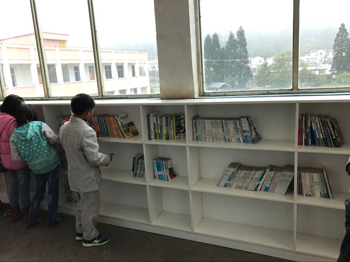 贵州新田小学的小学生正在开心的阅读同学们捐赠的图书