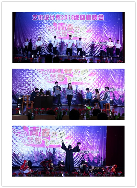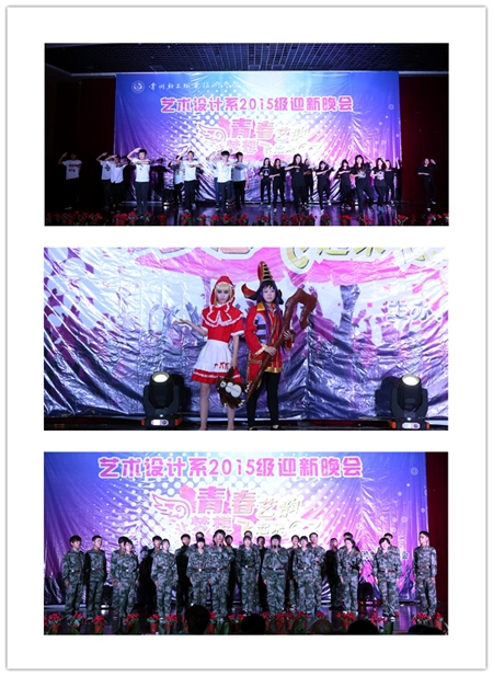 在新起点乐队带来的精彩表演后,赵书记登台致开幕词,拉开了“青春艺韵”迎新晚会的序幕。整台晚会节目内容新颖、丰富多彩,主要由我系各个社团选送。Only Dance舞蹈协会的爵士舞《energetic》、动漫社团的cosplay秀、精武社的双截棍表演《无双》、雨沫话剧社的搞笑话剧《艺考》……一个个精彩绝伦的节目为现场观众呈现了丰盛的视听盛宴。一段感人的军训视频后,由15级新生带来的大合唱《强军战歌》聚焦了所有人的目光。新生们统一穿着军训服装,用自己的歌声和大家一起共同回忆那段痛并快乐着的军训时光。随后汉服社的汉服展示《礼仪之邦》以及理颜形象社的走秀节目《shining love》继续引爆全场,台上模特靓丽多姿,她们那轻灵而娴熟的体态、动感而激情的走姿以及她们与音乐完美的融合,无不感染着在场的所有观众,赢得了台下的阵阵尖叫与掌声。当现场大屏幕放下,同学们看到自己通过电脑和手机发表的祝福留言被实时显示在“人人墙”上,并开始根据ID抽奖时,晚会现场的气氛达到了最高潮,雷鸣般的掌声、尖叫声经久不息,同学们用这样一种方式共同表达着对15级新生的欢迎和对艺术创意学院的热爱之情。