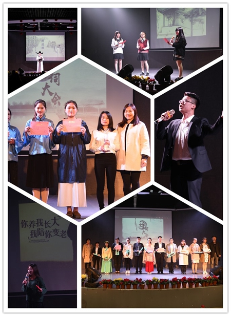 为提高学生的诗词鉴赏能力,弘扬中华优秀传统文化,艺术创意学院于4月6日晚在学院小剧场举行了首届诗词大会。大会邀请了学院吴亚萍老师、倪筱荣老师及艺术创意学院副主任朱琴老师担任评委,艺术创意学院党总支书记胡剑虹老师以及15、16级全体班主任老师也作为嘉宾出席了此次诗词大会。 本次诗词大会受到了同学们的广泛欢迎,艺术创意学院15、16级所有班级都报名参加了比赛。每班代表队参赛人数为三人,其中一位同学作为主讲者,首先朗诵选报诗歌,朗诵结束后对所朗诵诗歌从诗歌内容、作者生平、时代背景以及抒发的情感等多方面进行解析。另外两位同学则通过其它创意,帮助主讲者抒情达意。舞台上,同学们奋力拼搏,斗志昂扬,用最好的状态展现出自己的诗词底蕴。他们各显神通,用各种创意和想法踏寻古诗词的脚步,带领全场师生走进一个古色古香的世界,一时间,小剧场内诗词雅韵之风迎面扑来,选手们的出色表现赢得了现场师生的热烈掌声。经过各班级代表队的激烈角逐,15环艺331、16广告332班荣获一等奖。胡书记和三位评委为所有获奖代表队颁发了奖状、奖杯和奖品并合影留念。 倪筱荣老师在最后的点评环节赞扬了艺术创意学院同学们的精彩表现,同时也指出了同学们在比赛中暴露的问题和不足,对他们提出了更高的要求。倪老师指出,古诗词语言精炼,蕴含情感,意境深远,内容丰富,充分体现了我国语言文字的魅力。举办诗词大会既能弘扬中华传统文化、提升当代大学生文学素养,也有利于加强学校文化建设,进一步引导同学们积极践行社会主义核心价值观。