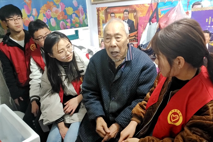 谢玉松曾被常州市抗日战争历史研究会授予“抗日英雄”的称号,是一位当年为了抵抗日寇入侵抛头颅洒热血的抗战老兵,至今身上多个部位仍然残留着当时负伤留下的痕迹。从2014年起,艺术学院团委学生会青年志愿者就与谢玉松固定结对,长期以来一直定期定点照顾他的起居。