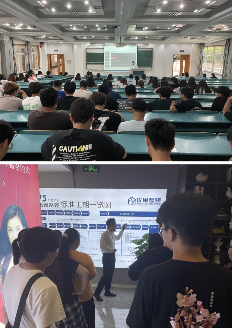 会上,优巢整装工程有限公司招聘负责人对公司进行了简要的介绍,强调了公司有关人才培养的理念,公司会采用系统化的培养方式,从个人能力、团队管理能力等全方面培养。优巢装饰将本次招聘的岗位需求与薪资待遇作了详尽的介绍,并对现场学生的就业疑问进行了专业的解答。