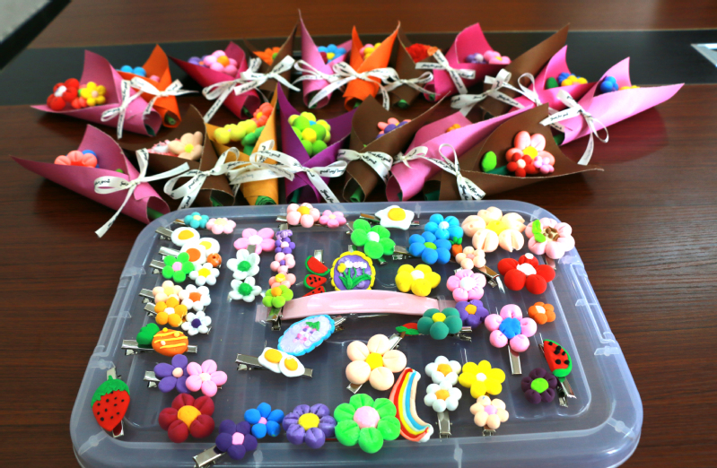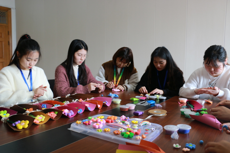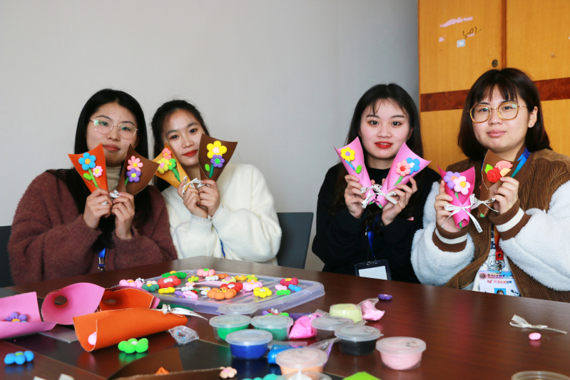节日前夕,同学们就提早做好了准备工作,他们学习手工制作教程,购买制作所需原材料,为给女教师们准备一份节日的惊喜。色彩斑斓的超轻黏土在同学们一双双巧手中变成一个个造型各异的精致花束和花朵发夹。同学们将自己亲手制作的节日手工艺品赠送给在各个工作岗位上教书育人的女教师们,祝愿每一位女教师手里有花,眼里有光,心里有爱,不止在三八节,而是在以后的每一天都能如花朵般精彩绚烂。