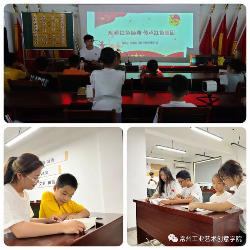 2022年7月中旬-8月上旬,常州工业职业技术学院艺术创意学院“浓郁真情暖童心,留守花朵向阳开”博爱青春暑期志愿服务队赴常州市溧阳市胜笪村、黄山村。结合学院专业特色,紧扣“人道、博爱、奉献”的红十字精神,围绕留守儿童这个特殊的未成年群体开展了系列活动,陪他们度过了一个愉快欢乐的暑假。少年儿童是祖国的花朵,是民族的未来和希望,而历史就是最好的教科书。志愿者首先和小朋友们共同观看了短片《鸡毛信》、《王二小》和《小兵张嘎》,小朋友看到“小英雄”英勇牺牲的时候一度哽咽,纷纷表示要以他们为榜样,学习他们的智慧和勇气,做个热爱祖国的好孩子。随后,志愿者又带领小朋友们一起阅读了其他的红色故事,引领少年儿童在红色经典故事中吸取精神力量,铭记革命光辉历程,传承红色基因。