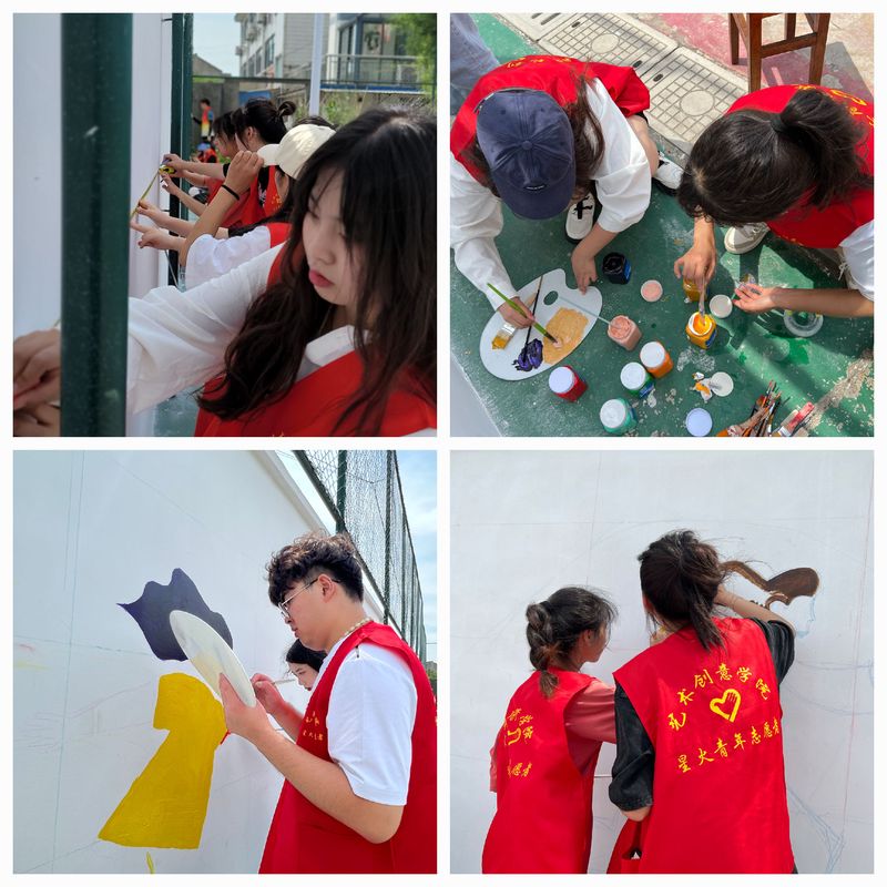 志愿者们充分发挥自己的专业优势,勾线打形、调制颜料、画笔上色,低头抬手间使原本朴素单调的墙面焕然一新,一幅幅色彩绚丽的画面逐渐展现出来,也吸引了许多村民驻足观赏。“天气闷热难耐,汗水湿透衣服,但是我们能够利用自身专业技能为美丽乡村建设贡献力量,让我们所学服务于社会、回报于社会。让我十分有成就感,这是我人生中宝贵的一次经历”志愿者裴嘉瑾说道。