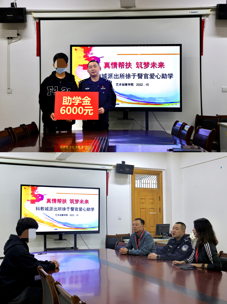 10月24日,科教城派出所徐于警官来到艺术创意学院,参与爱心助学金捐赠活动。艺术创意学院党总支书记管卫中、党总支副书记孟庆霞以及受助困难学生参加了此次活动。