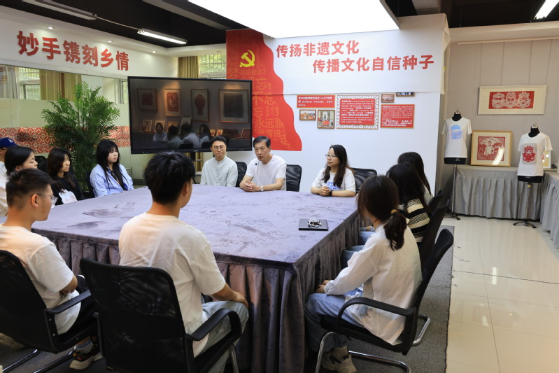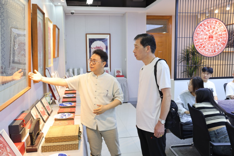 在传统工艺教研室主任李斌老师的带领下,张金兴老师参观了金坛刻纸杨兆群大师工作室,详细了解了目前工作室活动开展、非遗课程开设、刻纸项目体验等情况,并在李老师的讲解下,欣赏了工作室师生创作的非遗金坛刻纸和红色文创作品。张金兴老师对金坛刻纸作品中蕴含的精湛技艺和丰富的文化内涵表示赞赏,并对学院让学生参与到非遗技艺的学习和体验,继承和发扬中华优秀传统文化表示高度肯定。参观结束后,张金兴老师还以“传承非遗匠心,坚定文化自信”为题,为同学们开展了一场精彩的新思想公开课。讲座中,张金兴老师鼓励同学们继续传承和弘扬中华优秀传统文化,坚定文化自信,充分发挥自己的专业特长,努力学习和传承金坛刻纸技艺,为中华文化的传承和发展贡献自己的力量。