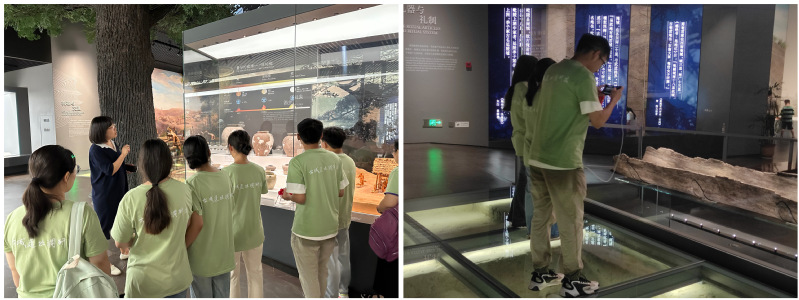 团队成员通过实地参观两处遗址的城水相依的城池形制、文化层构造、古遗迹,通过再塑造的捕猎、船只运输等古人日常生活和劳作场景,进一步认识了中华文明的灿烂文化。在遗址参观过程中,还通过与游客、管理人员等的交流访谈,了解遗址公园在路线规划、导视系统、文化展示等方面的特点与不足,了解访客、受众心中特色文化感知方面的真实感想,建设管理的初衷、困局及遇到的安全问题等。