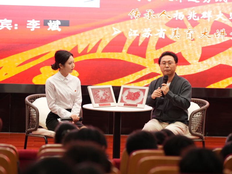 随后,国家级非遗“金坛刻纸”代表性传承人杨兆群大师的故事成为团课的核心篇章。2010年起,杨兆群自筹资金踏上寻访之路,十余年间走遍各地,记录全国70多位高龄民间剪纸艺人的技艺与故事。遗憾的是,陆续有7位艺人离世,更显这场“与时间赛跑的文明抢救”意义非凡。如今,杨兆群已收藏清代至今的剪纸精品、文献超5万件,2018年还因坚守刻纸文化入选“中国好人榜”,获“敬业奉献好人”称号。2019年,杨兆群与我校艺术创意学院携手成立大师工作室,受聘为客座教授,合作构建起“保护——传承——传播”三位一体的非遗振兴路径,让非遗传承走进校园。