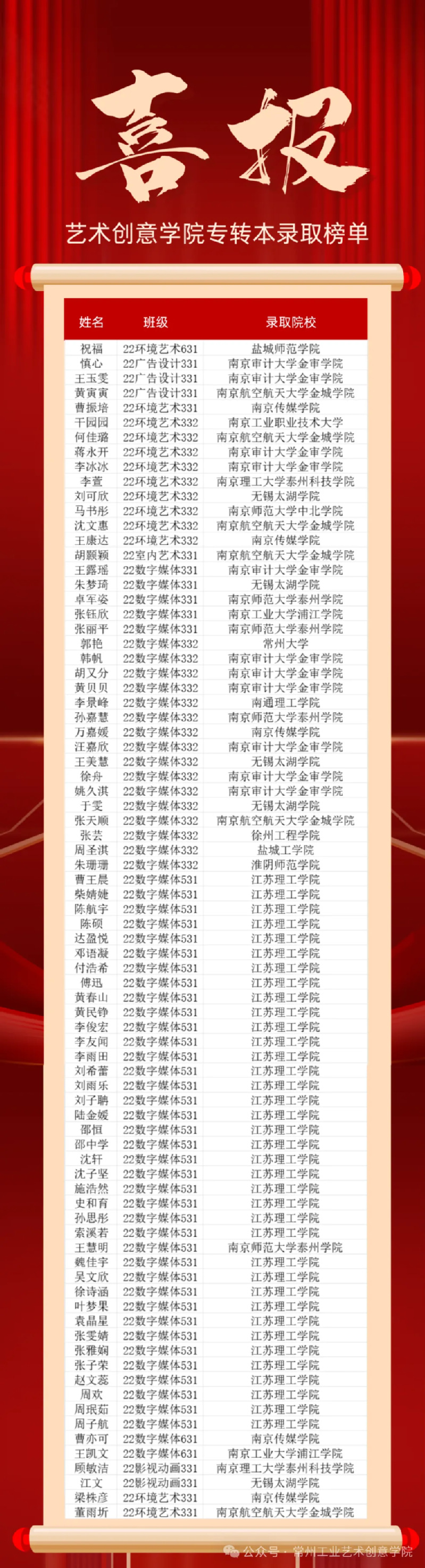 “十年常苦学,一上谬成名”,伴随2025年江苏省“专转本”考试录取结果的揭晓,艺术创意学院再创佳绩——我院80名考生凭借扎实的学识与不懈的努力,成功斩获本科院校录取通知书,录取率突破50%,创历史新高!
