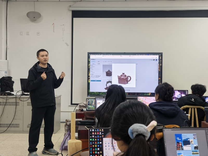 无锡供春人工智能科技有限公司创始人张雨航则带来《人工智能辅助紫砂设计》专题课程。他立足人工智能技术在传统工艺领域的应用实践,从AI 设计工具实操、紫砂创意数字化生成、传统纹样智能重构等方面展开授课。课堂上,张雨航通过案例演示,直观展示了人工智能如何快速生成紫砂器型草图、优化纹样布局,以及如何结合传统工艺规范调整设计方案,帮助同学们理解科技与传统的融合路径。他还带领同学们进行实操训练,指导大家运用专业设计软件将传统紫砂元素与AI 技术结合,尝试完成个性化创意设计,让同学们切实感受到人工智能为传统工艺带来的效率提升与创意拓展。