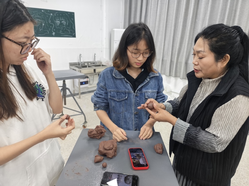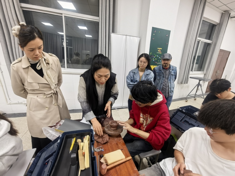 授课伊始,中国工艺美术大师王晓丽以“传统陶瓷、紫砂工艺的守正与创新”为主题,结合自身数十年的创作实践,从传统陶瓷、紫砂工艺的历史脉络、文化内涵等讲到当代创新案例。她用生动的故事和精湛的作品解析,让同学们深刻体会到传统工艺的独特魅力与时代价值,同时细致讲解传统工艺的核心技法,现场展示纹样勾勒、材质运用等实操技巧,手把手指导同学们进行基础练习,互动式教学让课堂氛围热烈而充实。
