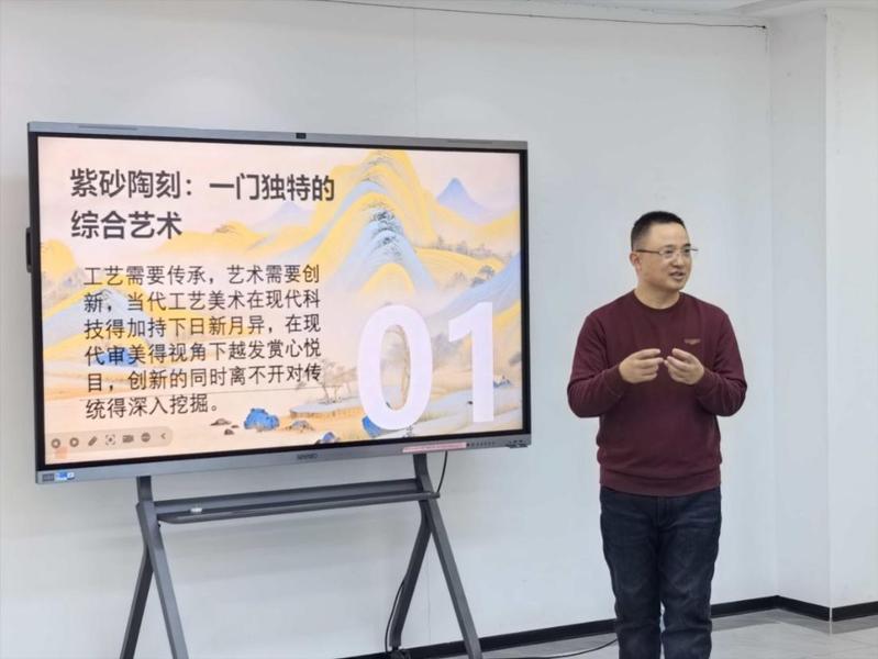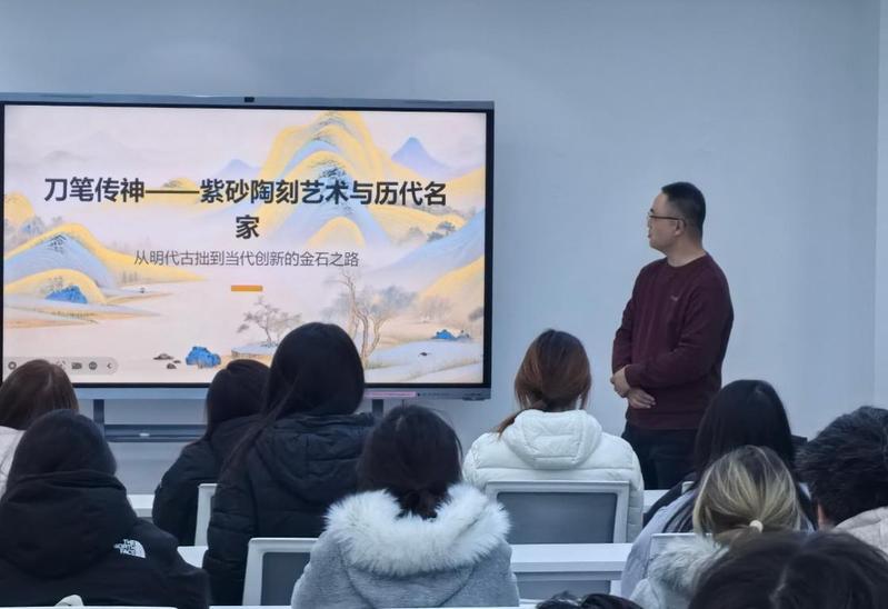 11月19日下午,常州市工艺美术大师张毓阳应邀为艺术创意学院25级学生开展了一堂题为“刀笔传神——紫砂陶刻艺术与历代名家”的专题讲座。讲座由艺术创意学院副院长唐一鑫主持。