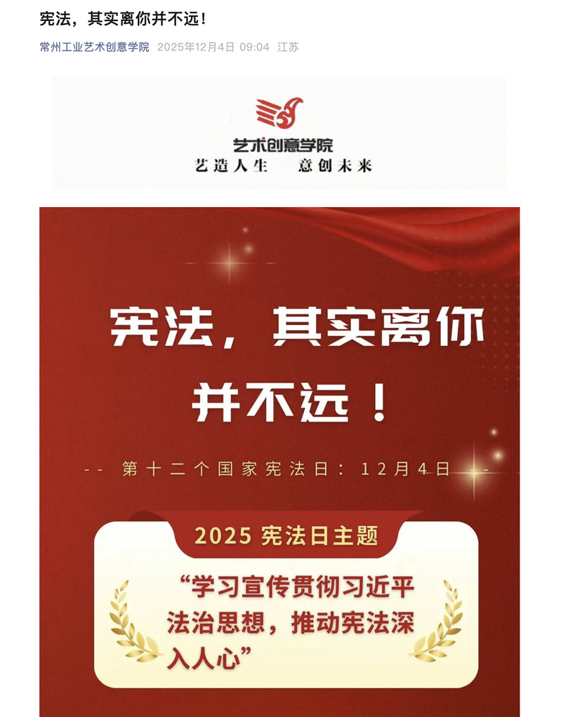 为弘扬宪法精神,维护宪法权威,艺术创意学院围绕第12个国家宪法日主题“学习宣传贯彻习近平法治思想,推动宪法深入人心”,于12月1日-12月5日精心组织开展系列宪法宣传周活动。学院通过线上线下相结合、理论实践相融合的方式,将宪法教育融入校园生活各环节,让宪法精神浸润心灵,让法治信仰伴随青春。