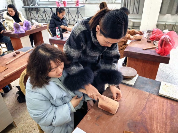 活动现场,女教职工们在中国工艺美术大师王晓丽的指导下,沉浸式体验揉泥、塑形、刻画等非遗技艺。普通的陶泥被赋予独特创意,或化作素雅花器皿,或塑成别致摆件,每一件作品都凝聚着女性的细腻心思与创作智慧。茶歇环节,跨部门、跨年龄层的女教职工们围坐畅谈,分享工作心得与生活感悟。
