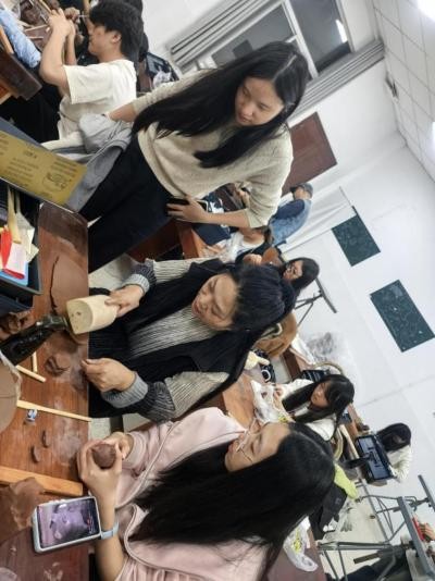 为让教学更具实效,王晓丽团队摒弃单一灌输式教学,采用“理论讲解 + 实操演练 + 互动研讨”的多元教学模式。课堂上,各位老师结合自身创作与行业经验,分享紫砂艺术的文化内涵、创作心得与AI 设计的应用技巧,针对学员在成型、陶刻、AI设计中遇到的问题逐一指导,优化设计思路;课后,鼓励学员自主打磨作品,组织小组交流活动,让学员在相互借鉴中共同进步。同时,团队延续实践教学传统,带领学员走进紫砂工坊、行业展览现场,让学员在一线感受紫砂工艺的魅力,在行业前沿开阔视野,在艺术碰撞中汲取灵感。